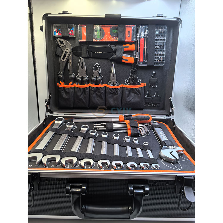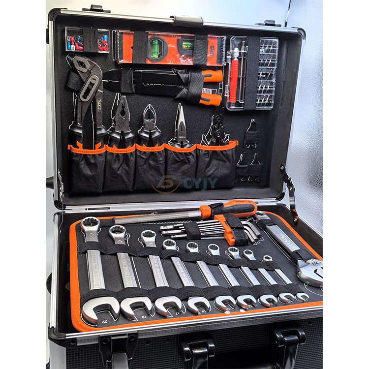 Ang 177-piraso na hand tool kit ay ginawa ng CYJY. Ang tool box ay naglalaman ng 177 na karaniwang ginagamit na tool. Kasama sa tool box ang mga wrenches, screwdriver, universal joints, tape measures, sockets, atbp. Ang bawat layer ng mga tool ay naayos at inilagay nang maayos at maayos. Ang disenyo ng buffer ay nagbibigay ng mas mahusay na proteksyon para sa iyong mga tool.