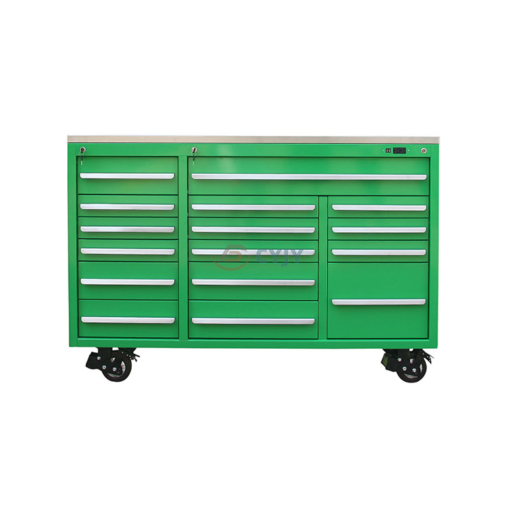 Nakukuha ng aming CYJY Heavy Steel Rolling Tool Chest ang pangalan sa pamamagitan ng pag-aalok ng walang kapantay na kapasidad ng storage at isang worktop na maaaring maglakbay sa anumang lupain. Nagtatampok ang opsyong ito ng flip-top compartment at Large bearing weight drawer—bawat isa ay may rating na humawak ng hanggang 60-80 KG. Nangangahulugan iyon na ang Heavy Steel Rolling Tool Chest ay makakapagdala ng higit sa 60KG ng mga tool sa isang push/pull lang ng handle.