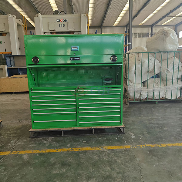 Ang Multi-Function Garage Tool Cabinet ay gawa sa mataas na kalidad na cold-rolled na bakal at berde ang kulay, na nagdaragdag ng isang splash ng kulay sa anumang workspace. Ang cabinet ay may maraming drawer na may mga accessory gaya ng mga ilaw, speaker, at plug strips.