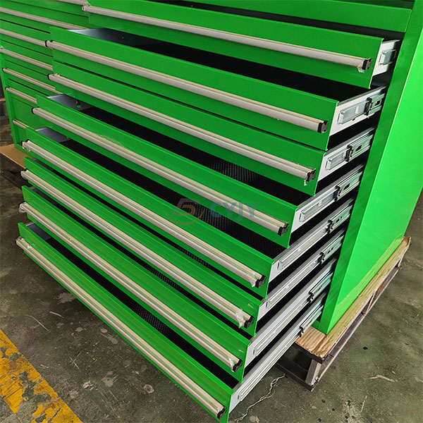 Ang aming mga cabinet ay nilagyan ng maraming mga tampok upang matulungan kang manatiling maayos. Marami silang drawer, na may ilang modelo na mayroong hanggang 20 drawer. Ang bawat drawer ay nilagyan ng hindi madulas na materyal upang panatilihing nasa lugar ang iyong mga tool at maiwasan ang mga ito sa pag-slide habang nagdadala.