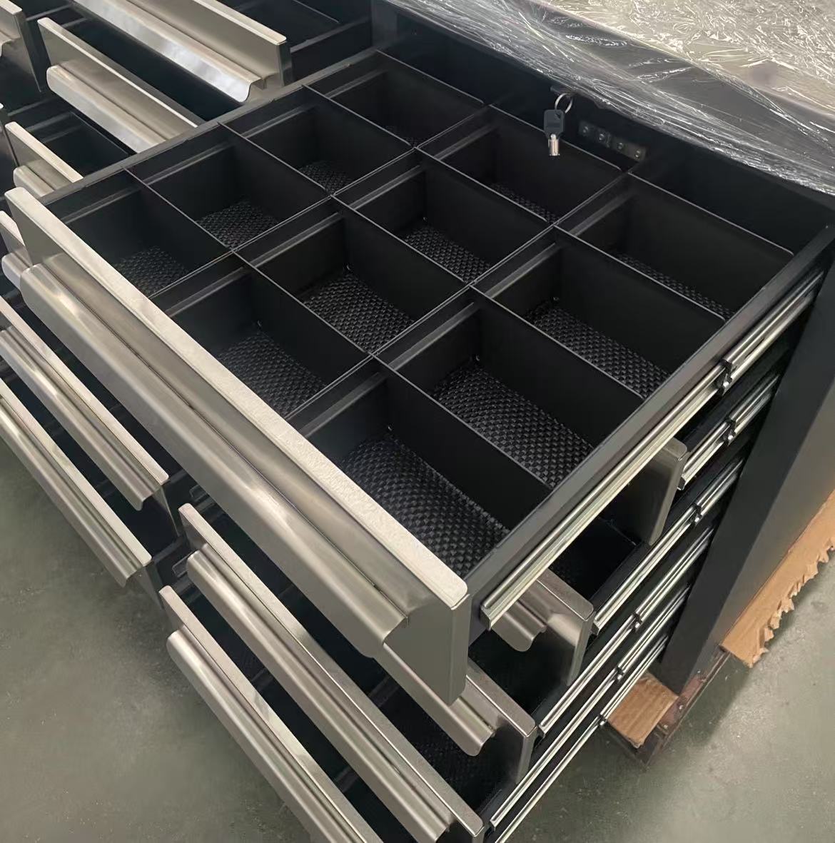 Bukod dito, ang mga drawer ay nilagyan ng mga adjustable divider, na nagbibigay kapangyarihan sa mga gumagamit upang ipasadya ang layout ng interior ayon sa laki at uri ng kanilang mga tool. Ang madaling iakma na sistema ng pagkahati ay hindi lamang nag -maximize ng paggamit ng puwang ngunit nagtataguyod din ng mas mahusay na samahan, na ginagawang mas mabilis at mas madaling maunawaan ang tool sa pagkuha ng tool.